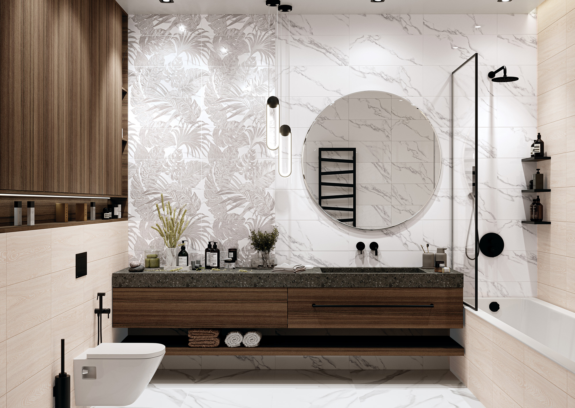 Коллекция Anima – это микс неоклассики и ботаники, построенный на гармоничном сочетании мрамора Calacatta, дерева и монохромного панно с изображением растений тропических лесов Амазонии. Коллекция создает легкую и спокойную атмосферу, в которой можно расслабиться и наслаждаться жизнью. Для законченности интерьера мы предлагаем использовать керамический бордюр с хромированным напылением, который эффектно подчеркнёт тропическое панно.