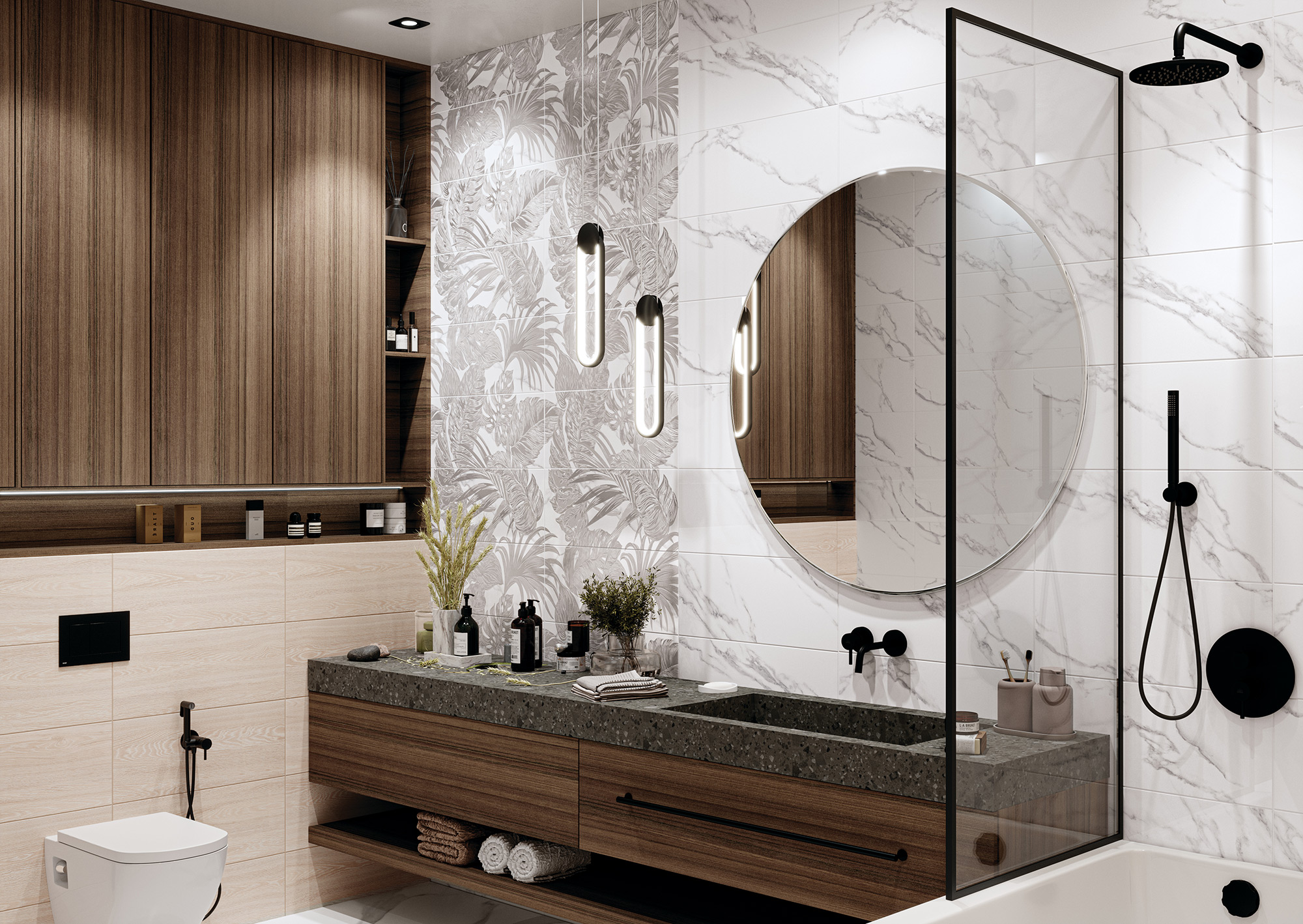Коллекция Anima – это микс неоклассики и ботаники, построенный на гармоничном сочетании мрамора Calacatta, дерева и монохромного панно с изображением растений тропических лесов Амазонии. Коллекция создает легкую и спокойную атмосферу, в которой можно расслабиться и наслаждаться жизнью. Для законченности интерьера мы предлагаем использовать керамический бордюр с хромированным напылением, который эффектно подчеркнёт тропическое панно.