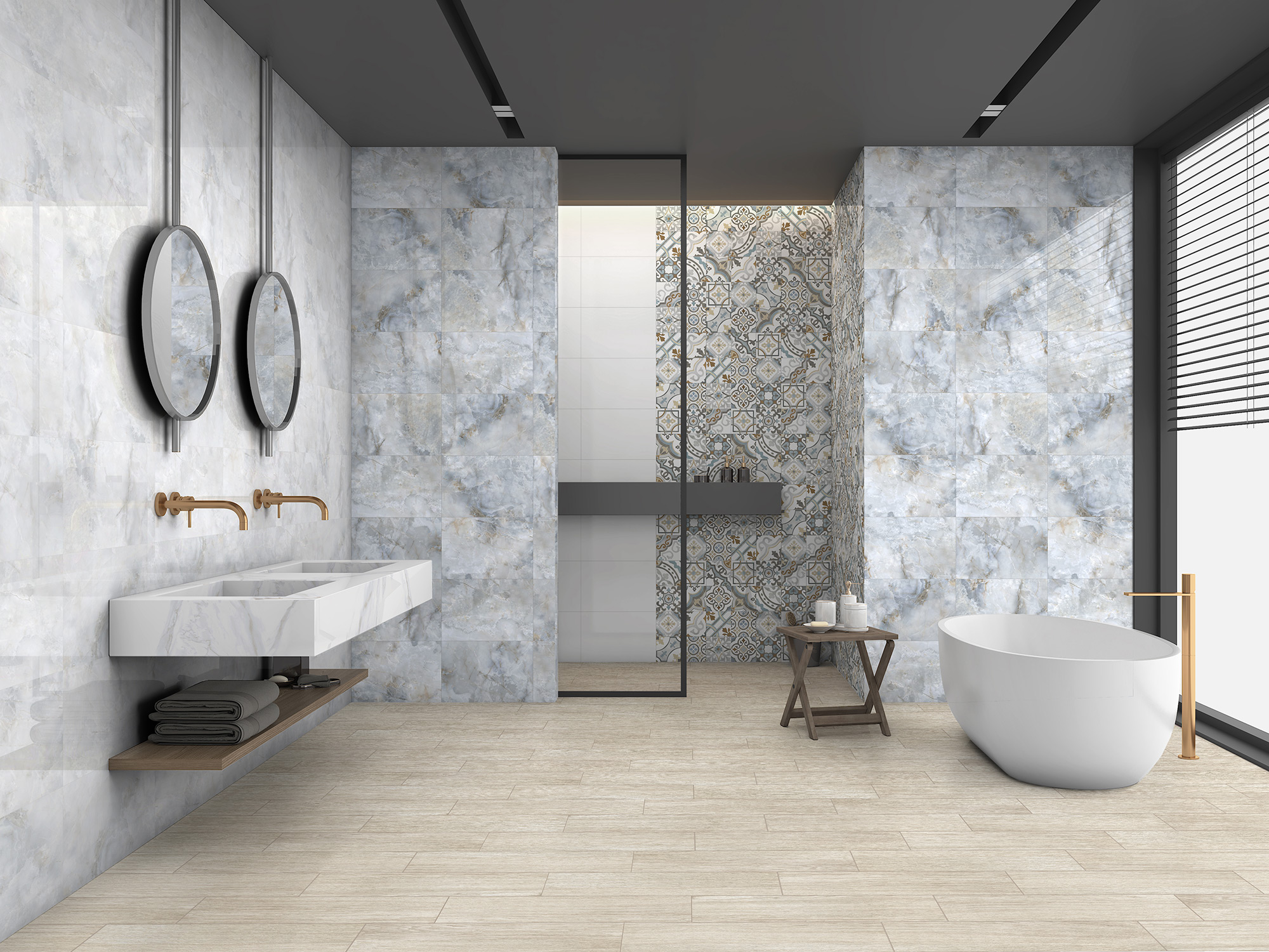 Коллекция Emotion создана для тех, кто устал от серых оттенков бетона и белого мрамора. Керамическая плита формата 27х40 приковывает взгляд нежно-голубой цветовой гаммой и характерным для оникса слоистым рисунком. Сочетание теплых тонов базовых плит создают атмосферу уюта и расслабленности. Акцентной деталью коллекции является декор с печворком, который прекрасно подчеркнет отдельные зоны в ванной комнате. Emotion подойдет для современных интерьеров, для которых характерны простор, обилие света и лаконичность.