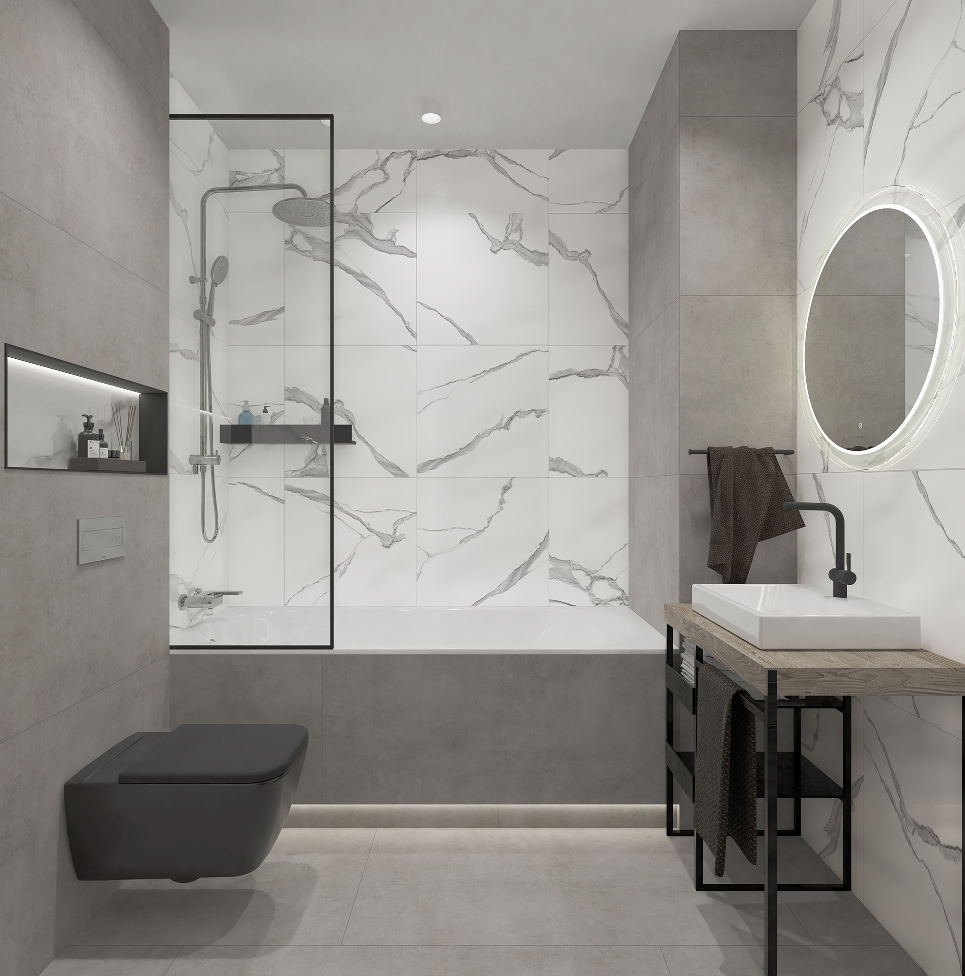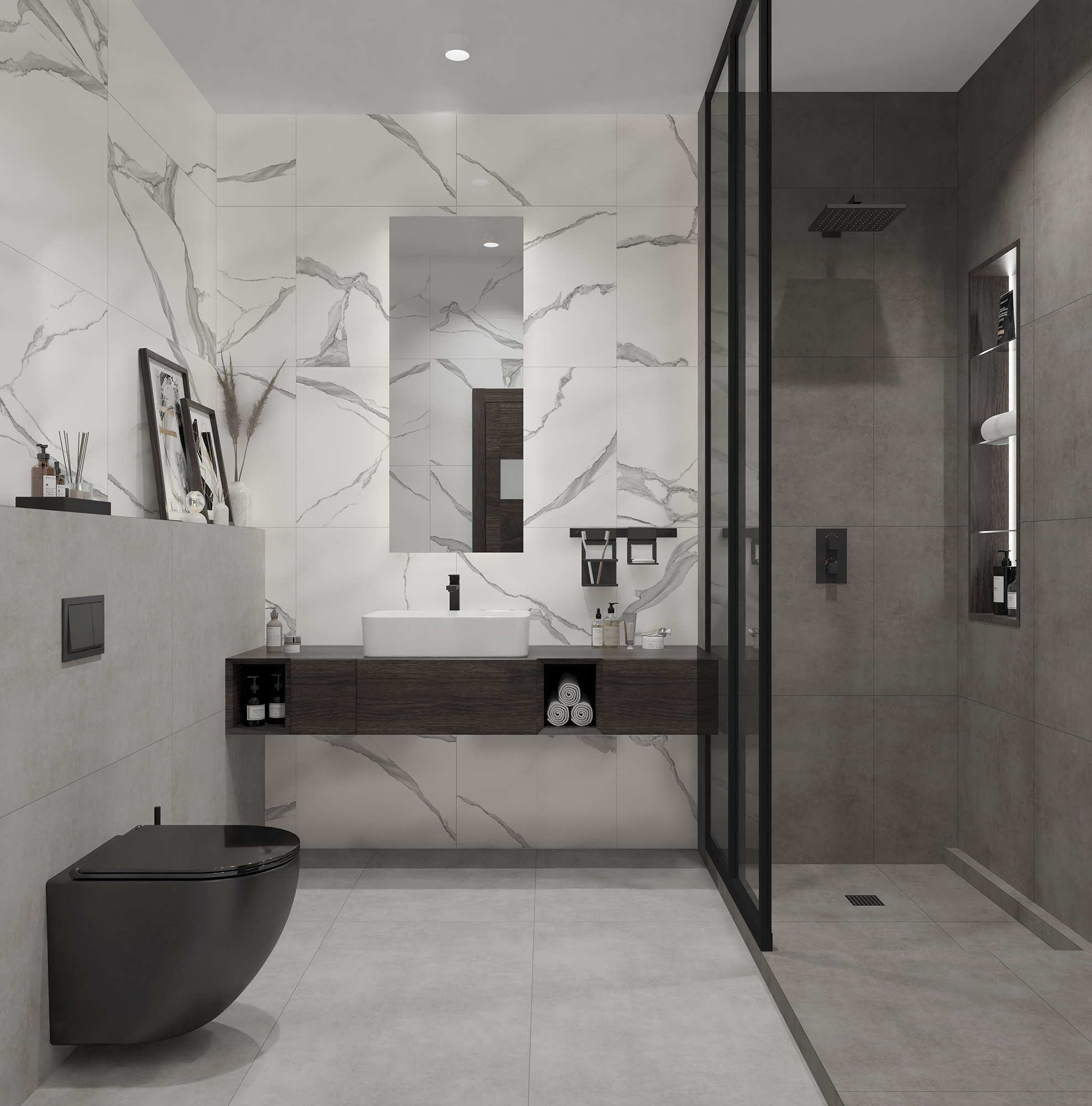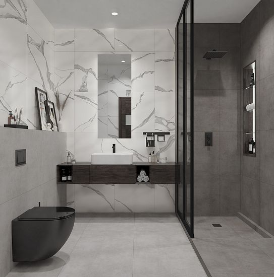 Коллекция Stardust – это имитация ровного лаконичного бетона, выполненного в четырёх оттенках: от тёплого светло-бежевого, до насыщенного тёмно-серого. Керамогранит Stardust визуально не отличим от натурального бетона, а благодаря нанесению слоя специальной защитной протекции он весьма практичен: высокая степень истираемости и лёгкость очистки. Бетон создаёт прекрасный контраст с глянцевым блеском сантехники, а универсальность фактуры позволяет дизайнеру применять его в различных стилистических решениях.