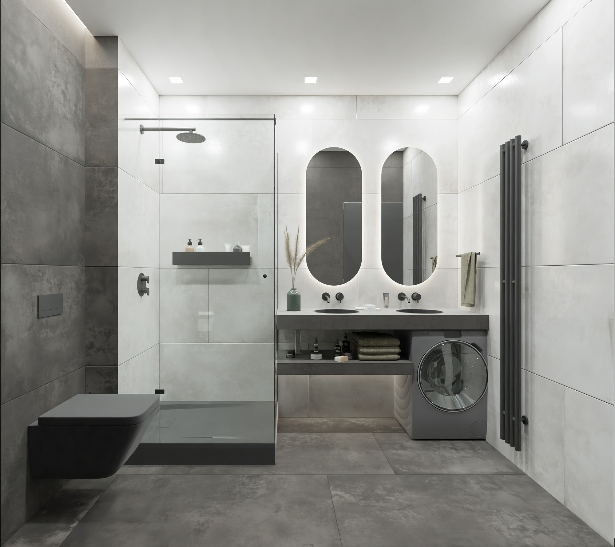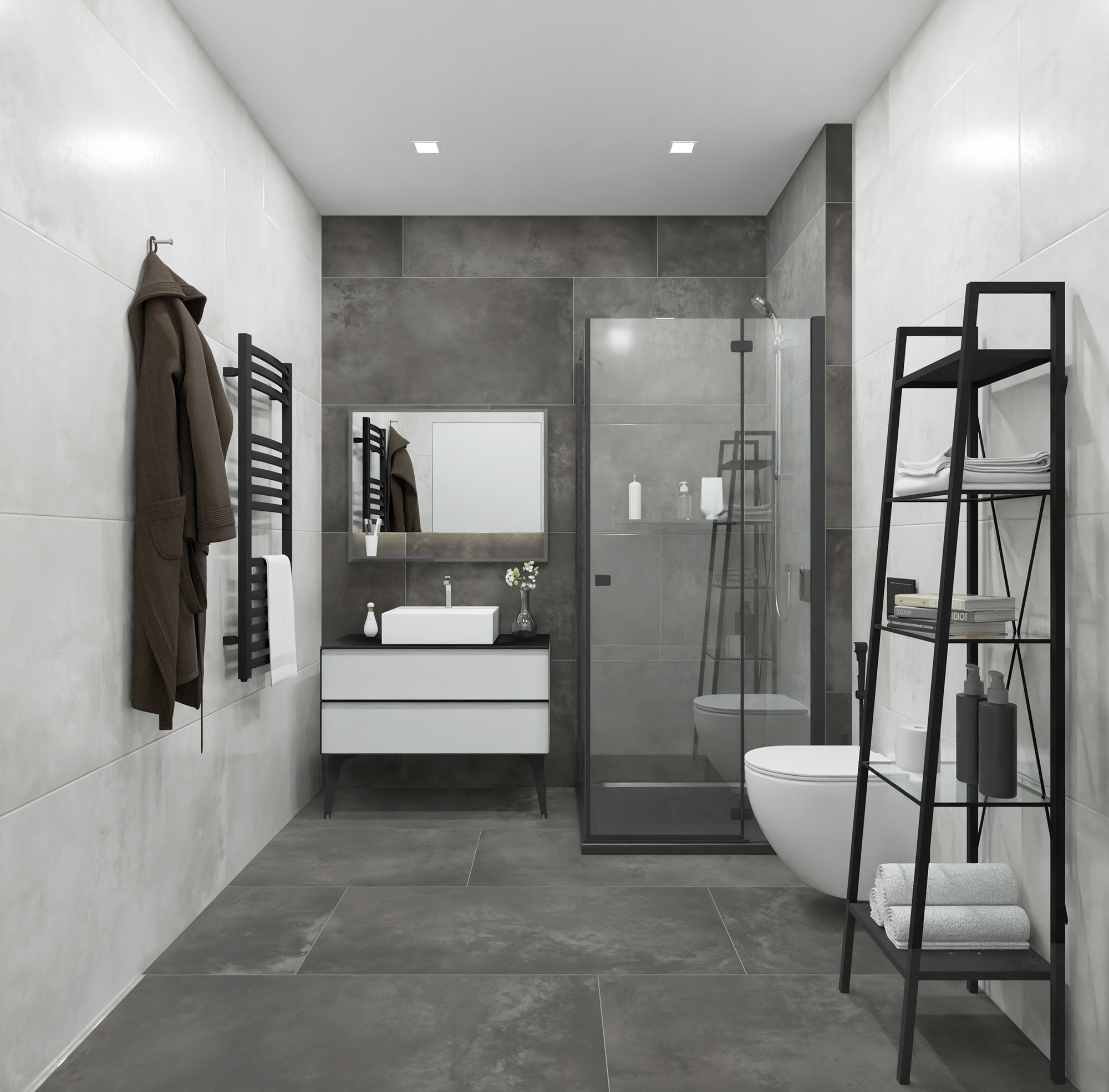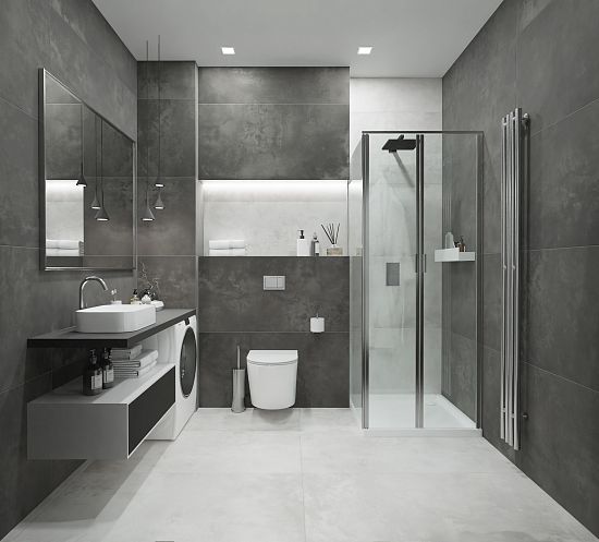 Infinium – это манифест современного дизайна, который смело объединяет красоту бетона и изящные мотивы природы. Три глянцевые, керамические плиты формата 30х60, имитирующие бетонную поверхность, задают тон всему пространству. Глянцевое покрытие придает плитке элегантность, играя отблесками света и визуально увеличивая пространство.