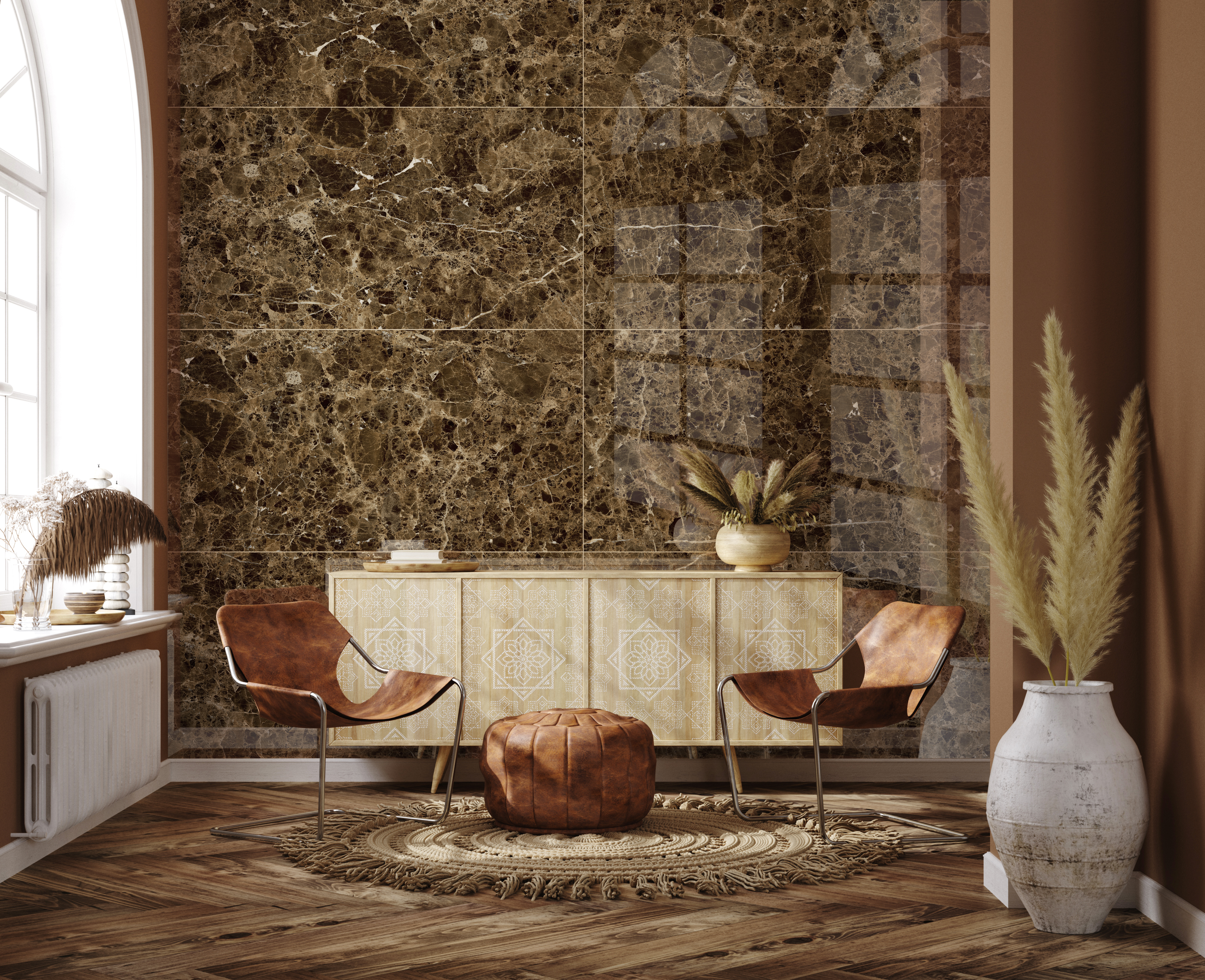Испанский мрамор Dark Emperador относится к премиум-классу и считается одной из самых популярных разновидностей. Одноименный керамогранит до мельчайших подробностей повторяет рисунок среднезернистой фактуры натуральной породы и все нюансы цветовой гаммы. Характерная особенность Dark Emperador – богатая палитра оттенков и кофейная пенка тонких прожилок. Роскошный внешний вид коллекции к Dark Emperador – отличный вариант оформления уютных и респектабельных интерьеров в классическом стиле. Он сам по себе является акцентной деталью и служит главным декором. Интересная особенность плиты заключается в игре оттенков при смене освещения, чем охотно пользуются дизайнеры для выделения отдельных зон или элементов интерьера.