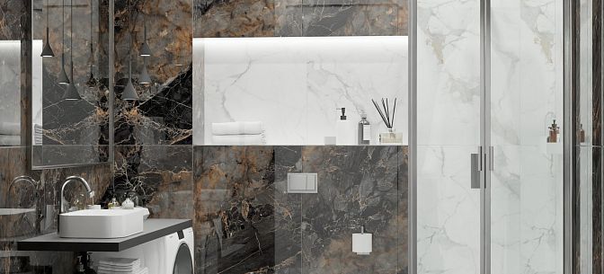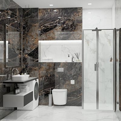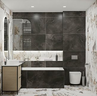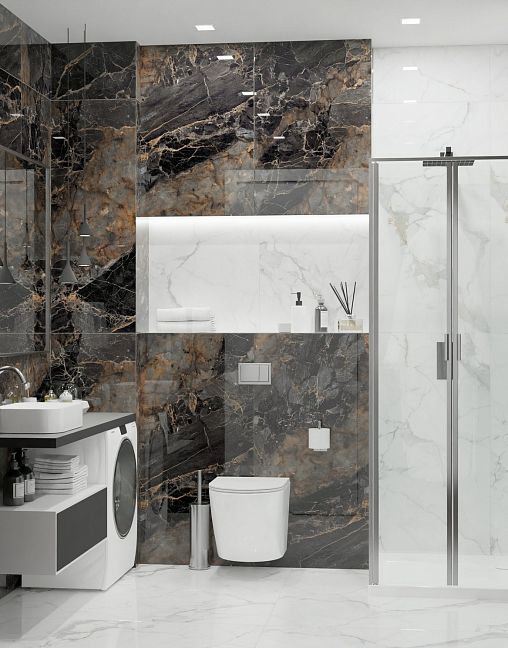 Коллекция керамогранита Calacatta Imperial – это сочетание изысканности и динамики, классики и современности. Плиты имитируют одну из разновидностей белого мрамора с характерным, узнаваемым рисунком. На белом с кремовым оттенком фоне протянулись серые и золотистые прожилки разной толщины. Несомненное преимущество керамогранита Calacatta Imperial – теплая цветовая гамма, которая значительно смягчает белый мрамор, избавляя его от холодной, стерильной чистоты. Темное золото прожилок добавляет рисунку живости, поэтому Calacatta Imperial дает возможность уделить больше внимания декору интерьера и вписать в него другие материалы, например, древесину в теплых, коричневых тонах и текстиль в близких оттенках. Спокойное очарование мрамора выглядит уместно везде, будь то небольшая ванная комната или театральный холл. Светлый фон помогает визуально расширить пространство и сделать его более освещенным.