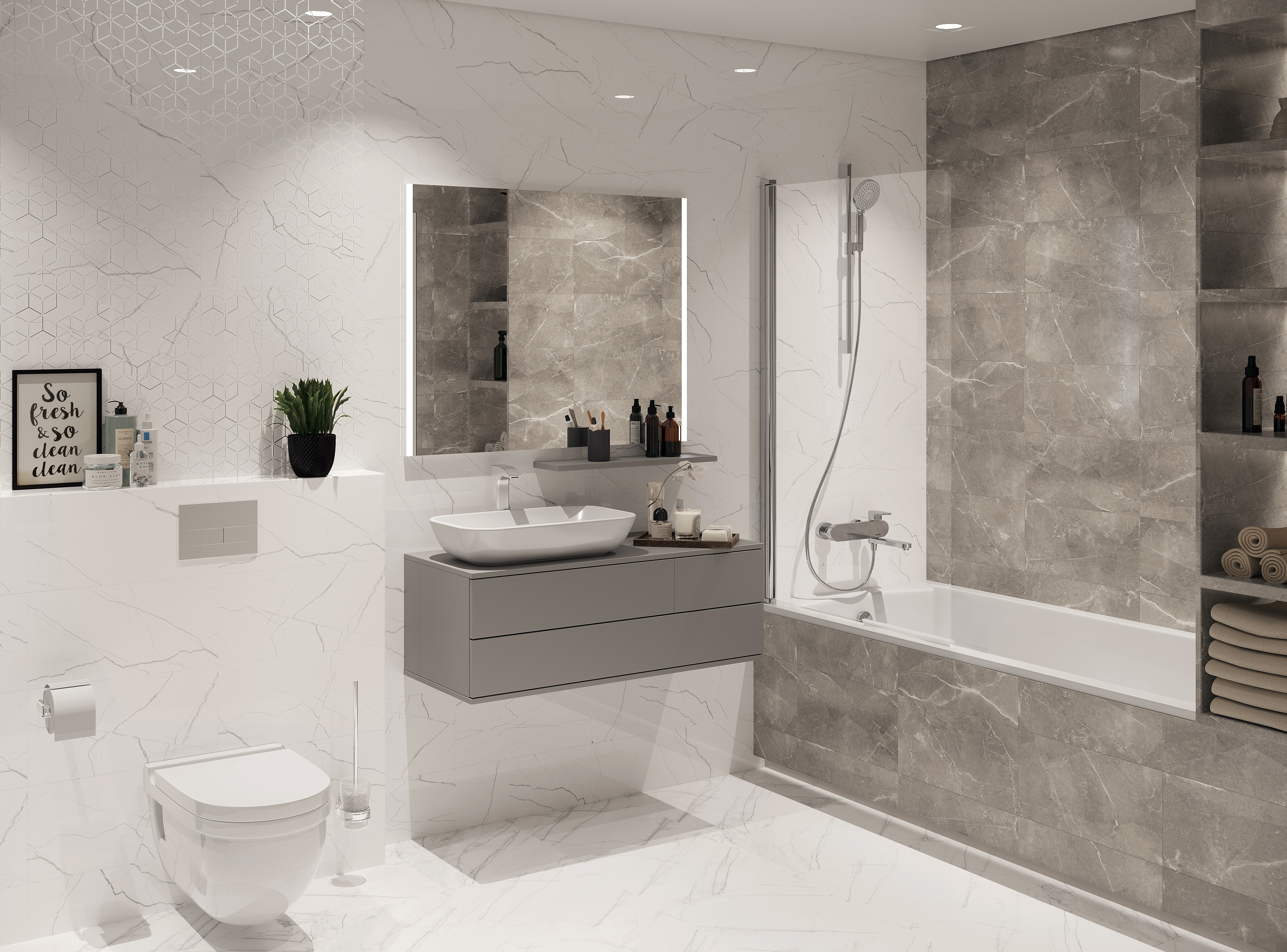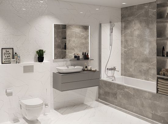 Коллекция Siluet создает атмосферу элегантности и в тоже время легкости, благодаря ненавязчивому декору с геометрическим принтом на фоне мрамора, украшенного люстром и шайном с эффектом мерцания. Фактура натурального камня передана очень реалистично, вплоть до мельчайших деталей.