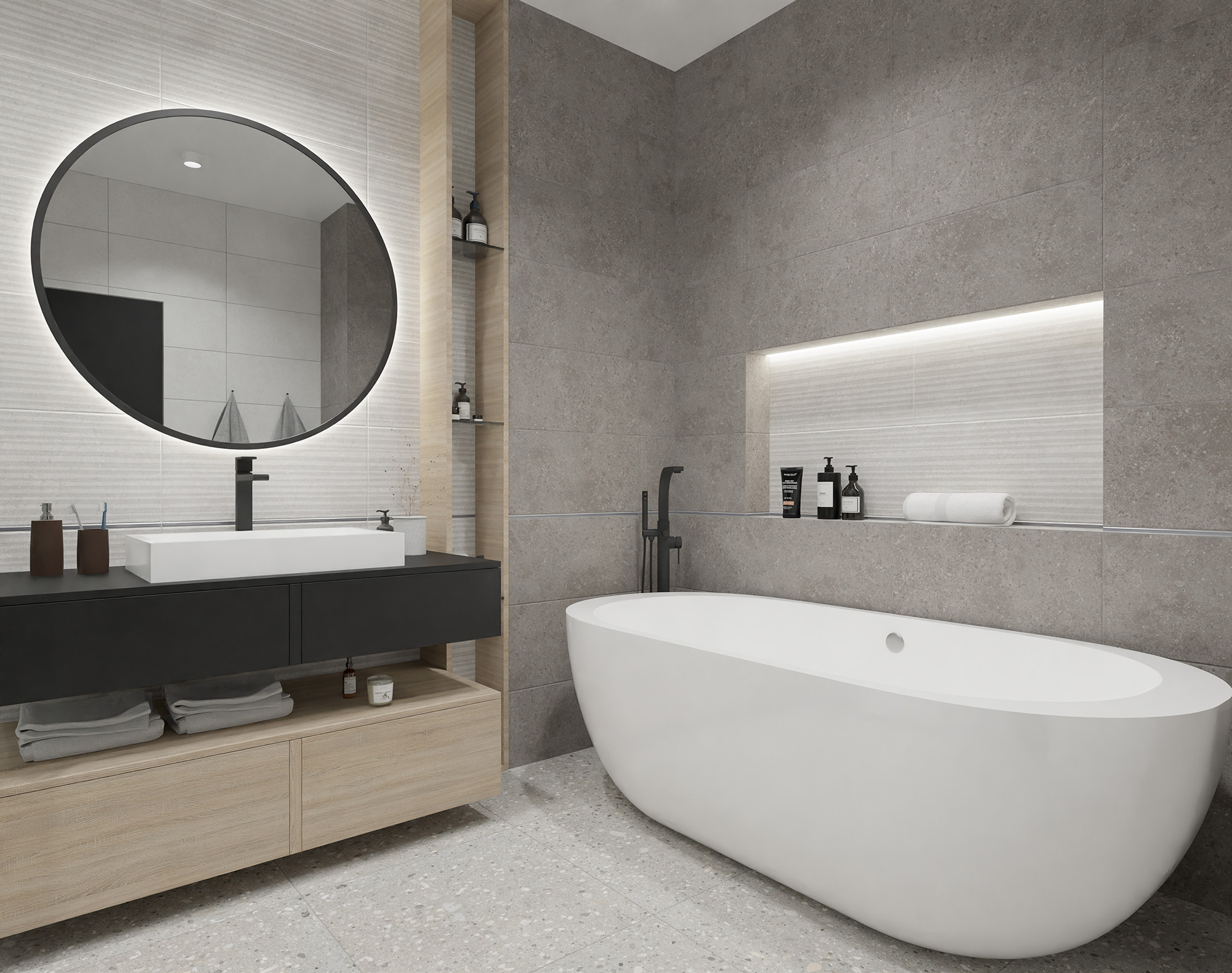 Лаконичная коллекция Sparkle вобрала в себя шедевральную неповторимость венецианского терраццо и атмосферный подход к декору. Базовые плиты в темно-сером и светло-сером исполнении идеально сочетаются между собой, завораживая калейдоскопом вкраплений. В качестве декора выступают плиты с тонкими продольными полосами, напоминающими отметины от воды на морских скалах. При всей сдержанности рисунка и палитры коллекция Sparkle выглядит по-настоящему ярко и по-современному стильно, позволяя создавать минималистичный, но насыщенный современный дизайн.