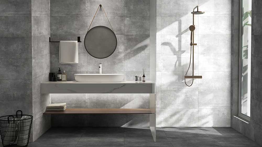 Infinium – это манифест современного дизайна, который смело объединяет красоту бетона и изящные мотивы природы. Три глянцевые, керамические плиты формата 30х60, имитирующие бетонную поверхность, задают тон всему пространству. Глянцевое покрытие придает плитке элегантность, играя отблесками света и визуально увеличивая пространство.