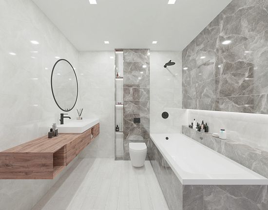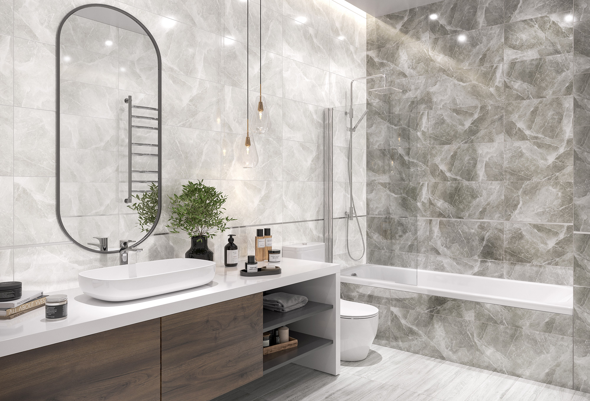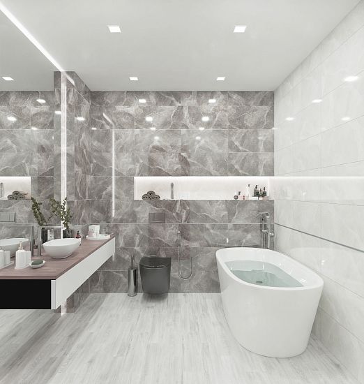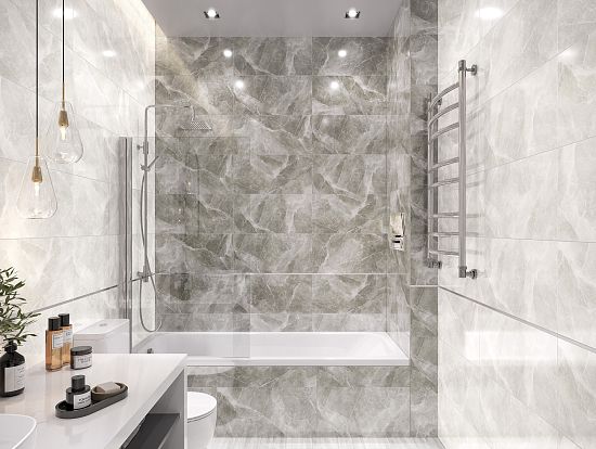 Коллекция Futuris – это благородное сочетание мрамора двух оттенков серого. Монохромный фон плит оживляет сеть белых туманных прожилок. Глянцевая поверхность подчеркивает динамичный рисунок, отражая свет и делая помещение визуально просторнее. Темно-серая плита будет идеальным решением для акцентной стены или для зонирования части пространства.