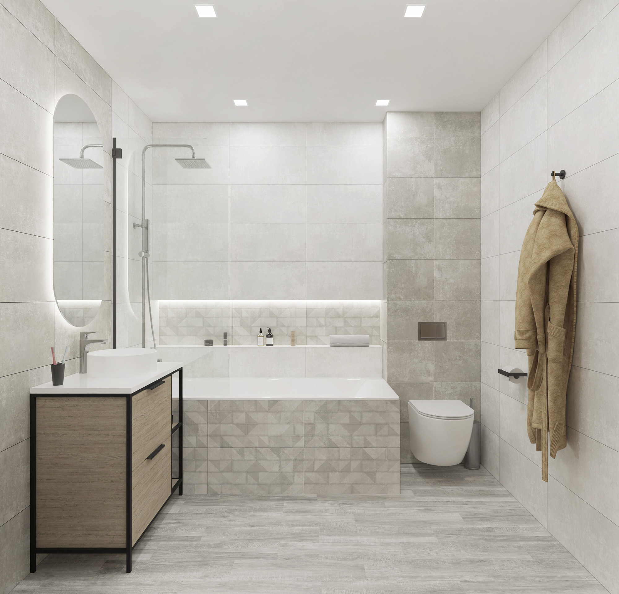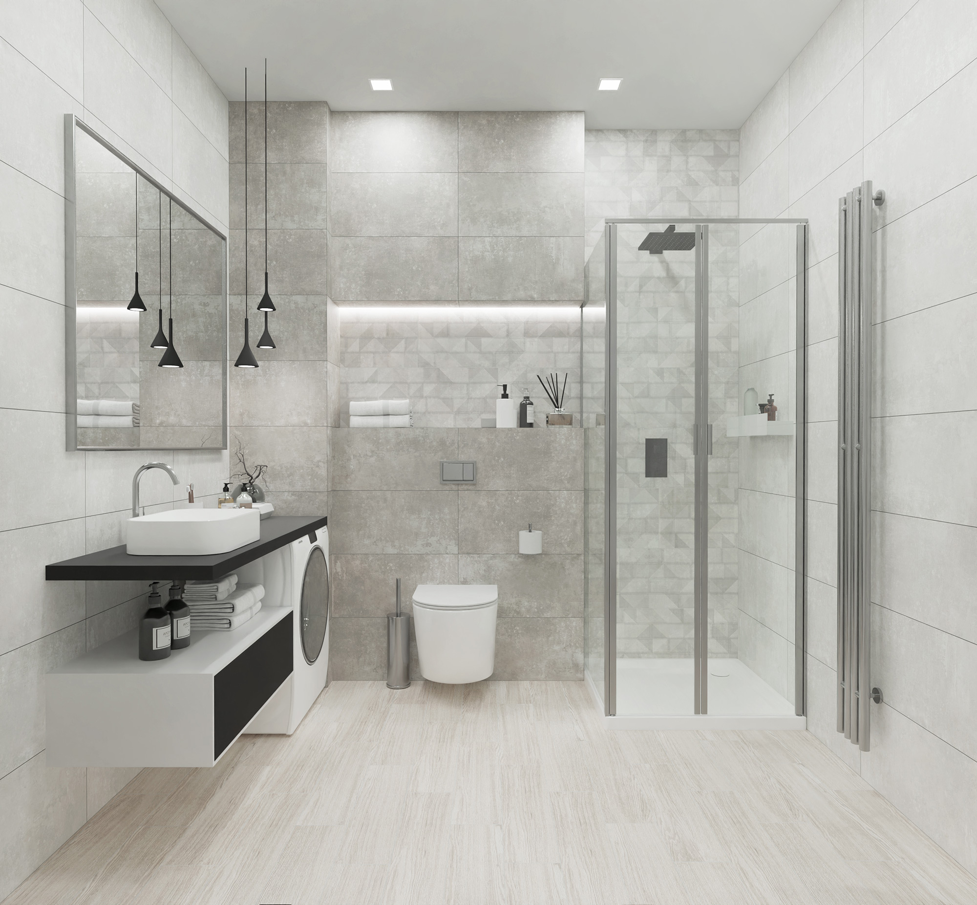 Infinium – это манифест современного дизайна, который смело объединяет красоту бетона и изящные мотивы природы. Три глянцевые, керамические плиты формата 30х60, имитирующие бетонную поверхность, задают тон всему пространству. Глянцевое покрытие придает плитке элегантность, играя отблесками света и визуально увеличивая пространство.