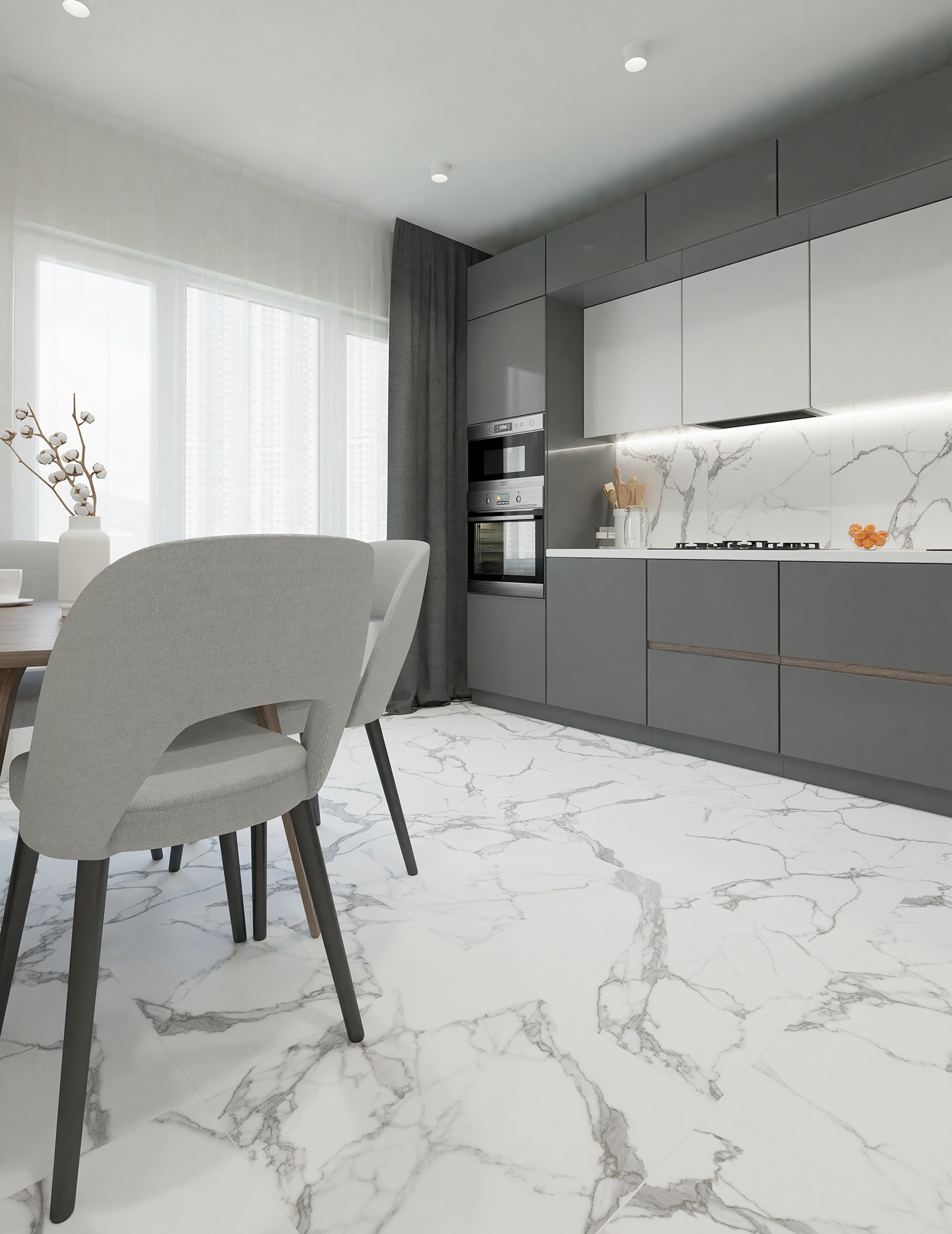 Kоллекция Oasis – это керамогранит с имитацией каррарского мрамора. Графитово-серые прожилки, в точности воссоздают натуральный материал, матовая поверхность подчеркивает природный характер рисунка. Керамогранит Oasis форматом 60х60 идеально подойдет для ванных комнат любой площади, а также станет универсальным решением для напольного покрытия в коридоре, кухни и лоджии.