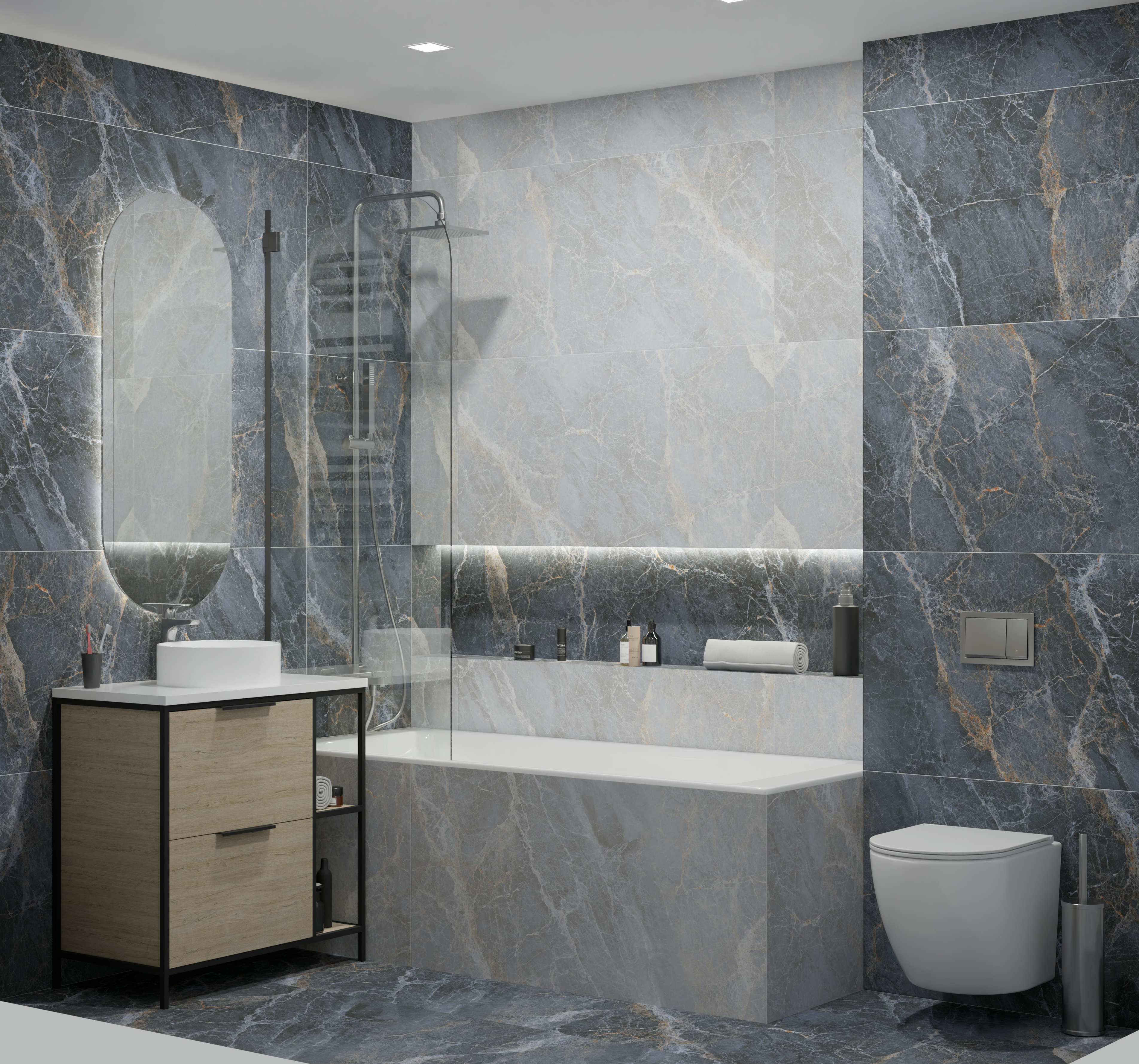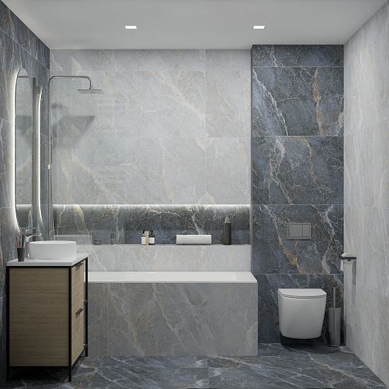 Коллекция Spanito – это ода гармонии контрастов, воплощенная в керамограните. Два оттенка, глубокий синий и теплый бежевый, образуют завораживающий дуэт, способный преобразить любое пространство. Синий, словно бескрайний океан, дарит ощущение спокойствия и глубины. Бежевый, в свою очередь, напоминает о мягком песке под лучами заходящего солнца, наполняя помещение уютом и теплом. Однако истинным сокровищем Spanito является не только цветовая палитра, но и изысканный рисунок. Множество тонких прожилок, пронизывающих поверхность керамогранита, словно нити золота, вплетены в канву каждого элемента. Эти золотые акценты придают коллекции особую роскошь и элегантность, создавая неповторимый визуальный эффект.